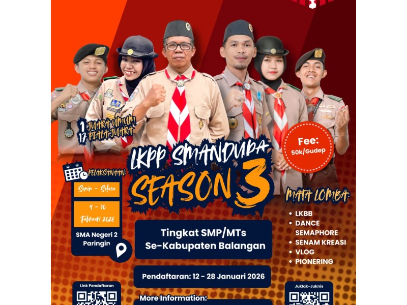 SALAM PRAMUKAHallo adik-adik penggalang Se-Kab Balangan! Dewan Ambalan Pangeran Antasari dan Ratu Zaleha, mengadakan Lomba Kreasi Pramuka Penggalang Season 3 loh! Siapa Nih yang belum daftar? Kakak kasih info penting nih!!Pendaftaran : 12 - 28 Januari 2026Technical meeting : 29...