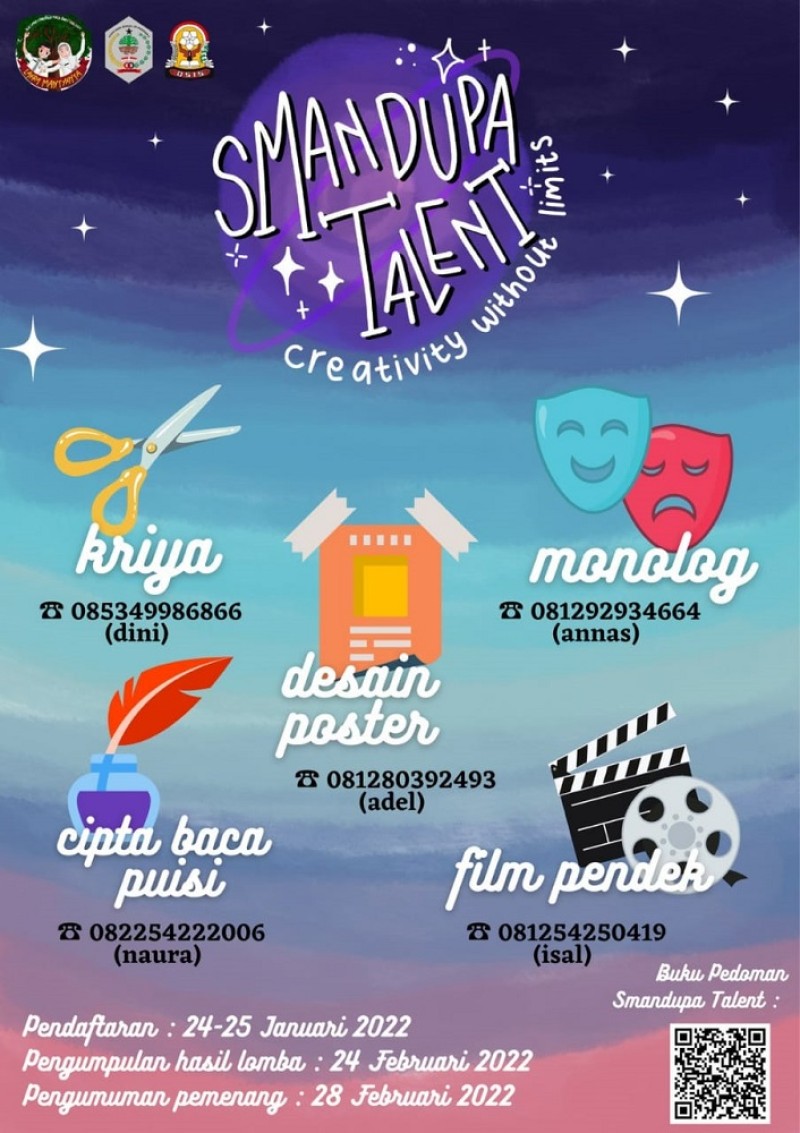 Kegiatan SMANDUPA Talent merupakan ajang talenta bagi siswa SMA Negeri 2 Paringin untuk menunjukkan bakat di bidang seni dan kreativitas. Kegiatan di bidang seni merupakan media pengungkapan hati dan ekspresi berbagai rasa, karsa, naluri, dan pikiran yang bermuara pada penumbuhan nilainilai estetika manusia. Proses kreatif dan daya cipta dalam berkesenian mengungkap kesatuan inovasi, ungkapan rasa, emosi yang sangat dalam tentang eksistensi dan esensi kehidupan. Kegiatan SMANDUPA Talent 2022 akan dilaksanakan oleh SMA Negeri 2 Paringin secara daring (online) terkait dengan kondisi pandemi Covid-19 yang masih dialami oleh Indonesia. SMANDUPA Talent diselenggarakan bertujuan untuk memfasilitasi bakat, minat, dan prestasi peserta didik di bidang seni. Adapun bidang seni yang dilombakan dalam SMANDUPA Talent tahun 2022 adalah seni pertunjukan dan seni penciptaan. Bidang seni pertunjukan mencakup bidang monolog sedangkan bidang seni penciptaan mencakup bidang desain poster, film pendek, kriya, juga seni pertunjukan sekaligus penciptaan adalah bidang cipta baca puisi.
