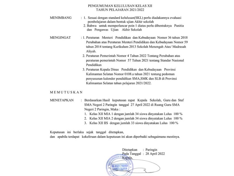 "Mampu mencetak generasi yang berkualitas dan berkarakter" adalah salah satu harapan dan doa dari Bapak Drs. Muhammad Yusuf Effendi, M.AP selaku kepala Dinas Pendidikan dan Kebudayaan Provinsi Kalimantan Selatan yang langsung beliau utarakan dihadapan Kepala SMA Negeri 2 Paringi ...