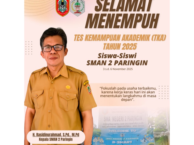 Telah dilaksanakan - TKA 2025 SMAN 2 Paringin telah melaksanakan rangkaian Tes Kemampuan Akademik (TKA) mulai dari : ✅ Gladi Bersih : 27-30 Oktober 2025 ✅ Pelaksanaan TKA : 3-6 November 2025 Seluruh kegiatan berjalan lancar berkat kesiapan murid, ...